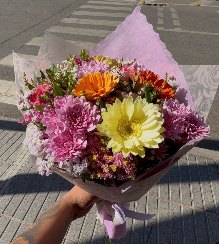 Cada flor aporta su carácter: la alegría de las gerberas, la elegancia de las rosas y la frescura natural de las flores de acompañamiento. Todo cuidadosamente armado y envuelto en papel coreano de alta calidad, con suaves cintas decorativas, logrando un ramo luminoso y moderno, ideal para sorprender en San Valentín o celebrar momentos especiales con un gesto lleno de color.