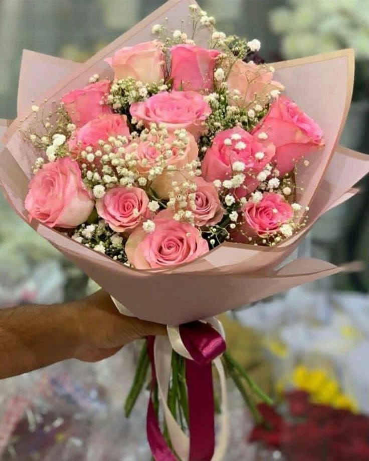 Este elegante ramo está compuesto por 15 rosas rosadas frescas, acompañadas de delicada gypsofilia, envueltas cuidadosamente en papel coreano premium y terminadas con cintas decorativas que realzan su presentación.