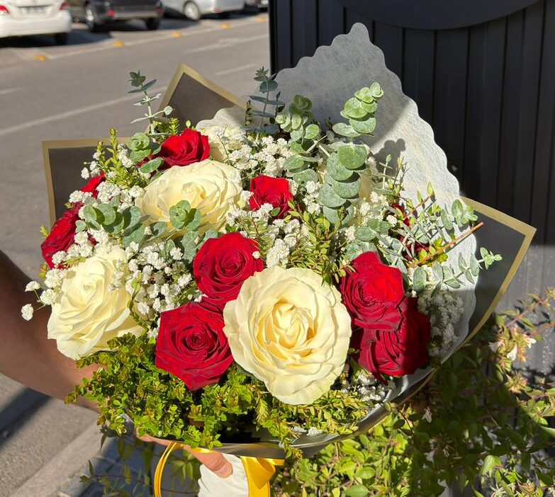 Un ramo de estética natural y elegante. 15 rosas frescas en tonos rojos y blancos, combinadas con eucalipto y delicada gipsofilia, crean un arreglo armónico, fresco y lleno de carácter.