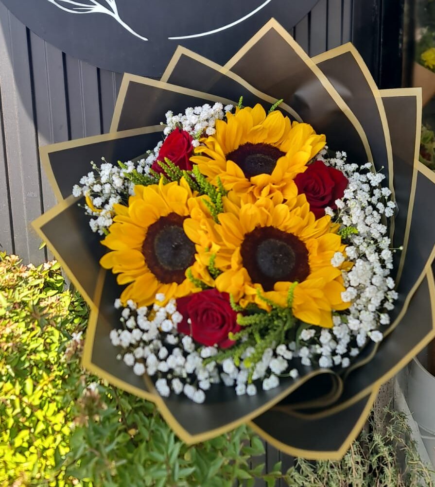 Una combinación que no falla: 3 girasoles radiantes y 3 rosas frescas, acompañados de delicada gipsofilia, cuidadosamente armados y envueltos en papel coreano de alta calidad, con finas cintas decorativas.